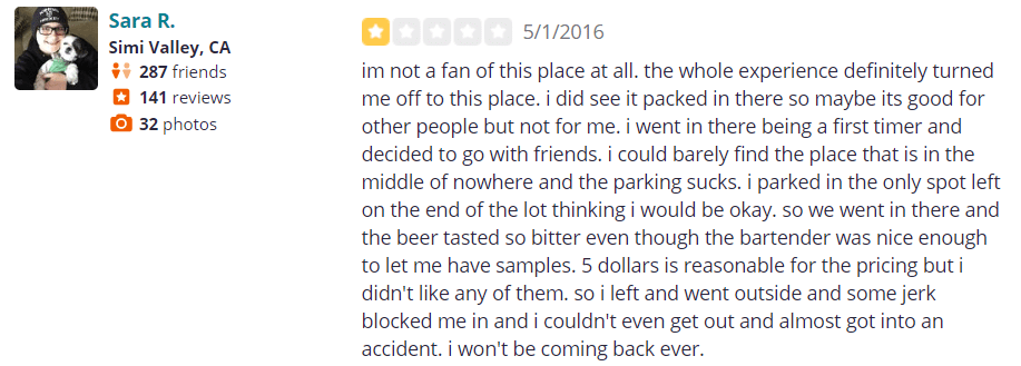 Nothing really to report here. Somehow this place has ten pages of four and five star reviews. The worst one I could find just complains about parking. “This place is so popular that I had a hard time finding parking. One star!” Nice review, Sara R.