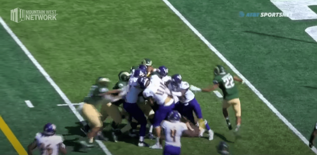 Not the prettiest touchdown in the world, but an important one. The Bulldogs had just scored to take a 28-24 lead, their first lead of the game. Fresno had all the momentum at this point after weathering an early storm. Instead of lying down, the Rams came right back and took the lead.