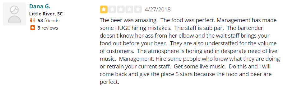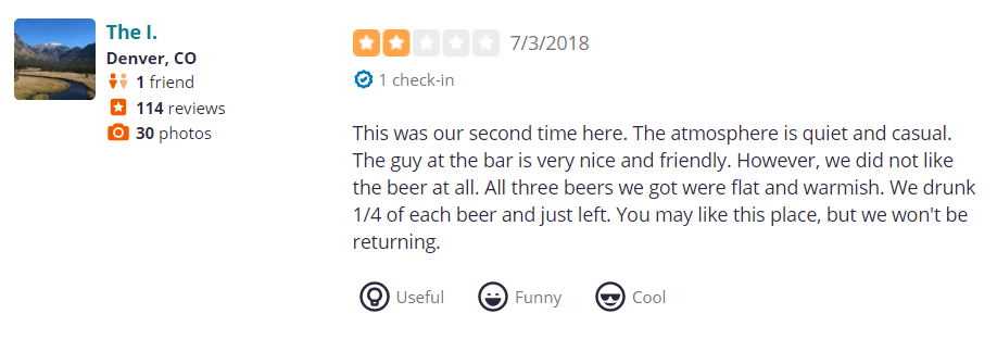 This place has been open since 2015 and no one-star reviews yet, pretty good! “The I” thought their beers were “flat and warmish”. Is he describing his beers or my date last Saturday night? HELLO!! ZING!!