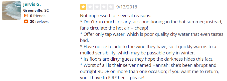 Pretty good reviews overall for this place. The only one-star came from our friend Jervis G. He complains that the wine “quickly warms to a mulled sensibility.”