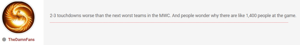 Another day, another win against a crap Mountain West team. These Lobos were 2-10 with wins over Sam Houston State and New Mexico State. Rams should have won in a blowout, but the Lobos were able to keep it close throughout.